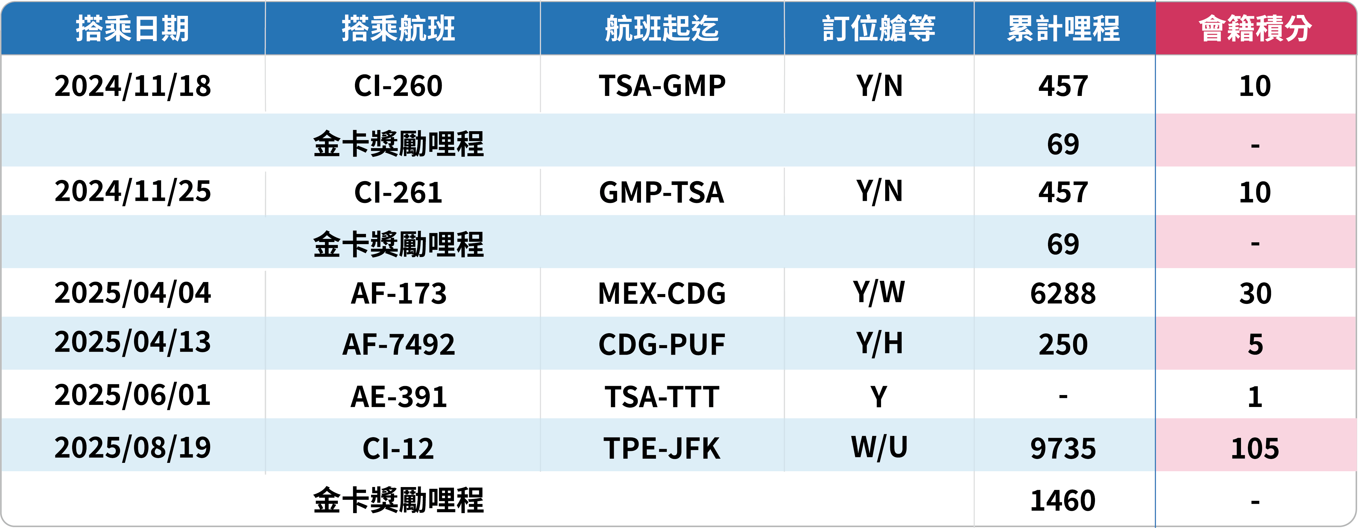 其中包含 CI-260、CI-261、AF-173、AF-7492、AE-391 以及 CI-12 等航段,這些航班的艙等與哩程皆符合新制積分計算標準。至於金卡獎勵哩程,由於屬於獎勵票性質,將不列入會籍積分累積。